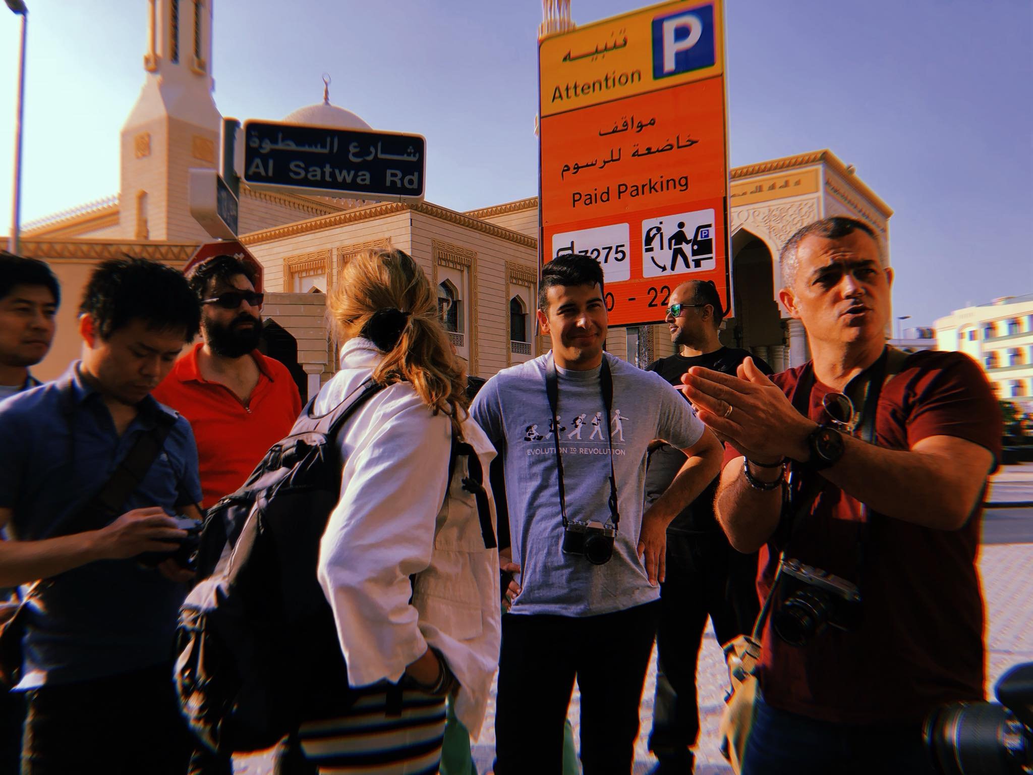 Group of tourists talking on a street corner with a large orange parking sign and a blue street sign that says Al Satwa Rd in the background.